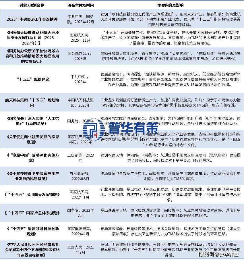“十四五”以来,政策从构建应用体系(如应急通信)和鼓励技术降本开端。进入“十五五”前夕,政策层级和力度显著提升:“十五五”规划建议将航空航天明确为战略性新兴产业,提供了根本发展依据;随后,国家航天局《行动计划》出台了开放资源、设立基金等22项具体举措,标志着支持政策进入密集落地期。2025年中央经济工作会议则进一步定调以科技创新引领未来产业。整体政策环境呈现出“顶层指引明确、产业措施具体、安全与发展并重”的特征,为TMS行业带来了空前的战略机遇。